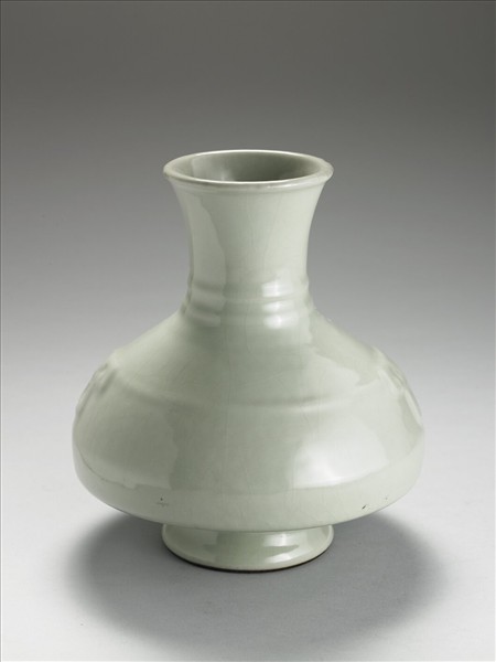 撇口,直長頸,斜肩,碩腹,雙暗環耳,下端折入成平底,下接圈足。頸部及腹部飾數道凸弦紋,全器施仿汝青瓷釉,呈淡青色,釉面佈滿淺色開片紋。足底緣露胎,塗赭色護胎汁。底以青花書「大清雍正年製」六字三行篆書款。