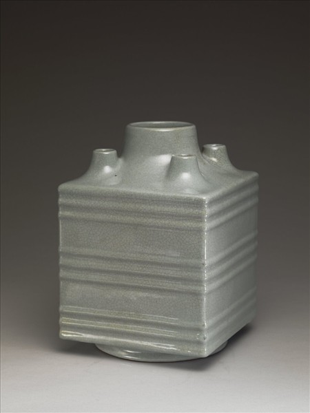 方瓶,圓口,折肩,方腹,圓形矮圈足;肩上出管狀四孔,腹部有三道一組的弦紋,共三組九道。形制內圓外方類琮。全器施青釉,呈灰青色,有深色細密開片紋。足底施護胎汁,呈鐵黑色。方形器身底部四角各有一支釘痕,圈足內底施青釉,有「大清雍正年製」三行六字青花篆書款。