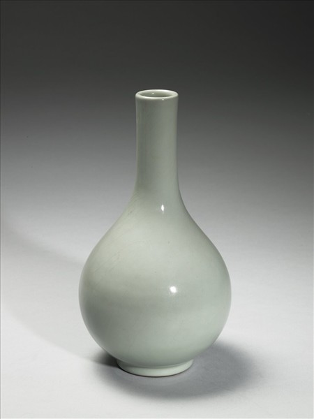 小圓口,長直頸,碩腹,圈足。整器施青釉,並見細長形開片。足露胎一圈,塗褐色汁,足內青釉地「大清乾隆年製」三行六字篆款。
