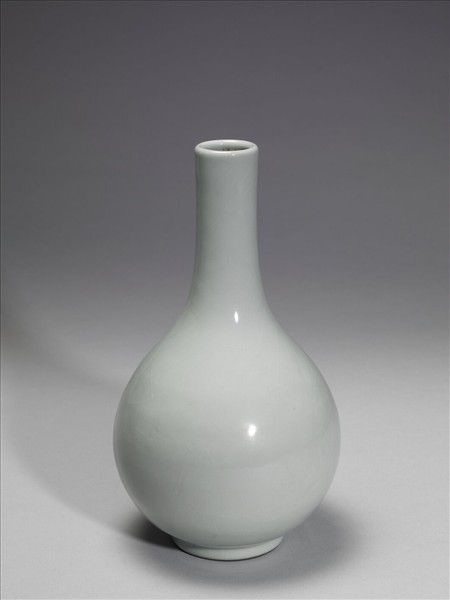 小圓口,長直頸,碩腹,圈足。整器施汝釉,並見開片。足露胎一圈,塗褐色汁,足內青釉地「大清乾隆年製」三行六字篆款。