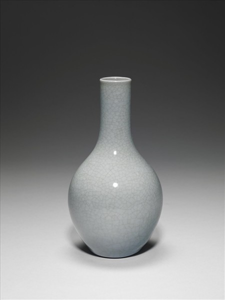 小圓口,長直頸,碩腹,平底內凹成足。全器施汝釉,並見細碎開片,外壁光素無紋。足露胎一圈,塗淺褐色汁,足內汝釉地「大清乾隆年製」三行六字篆款。