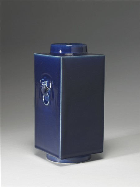 器仿禮器玉琮形,中圓外方,圓口微斂,平肩,方形器身,深直腹,圈足,帶銜環象首耳一對。通體施霽青釉,色靛藍光亮。圈足露白胎,底心青花書「大清乾隆年製」三行六字篆款。