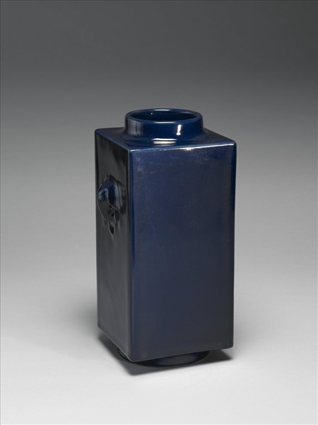 器仿禮器玉琮形,中圓外方,圓口微斂,平肩,方形器身,深直腹,圈足,帶銜環象首耳一對。通體施霽青釉,色靛藍光亮。圈足露白胎,底心青花書「大清乾隆年製」三行六字篆款。