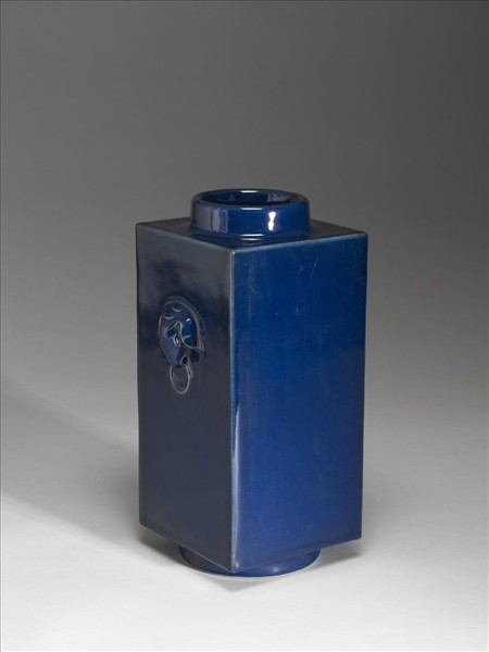 器仿禮器玉琮形,中圓外方,圓口微斂,平肩,方形器身,深直腹,圈足,帶銜環象首耳一對。通體施霽青釉,色靛藍光亮。圈足露白胎,底心青花書「大清乾隆年製」三行六字篆款。