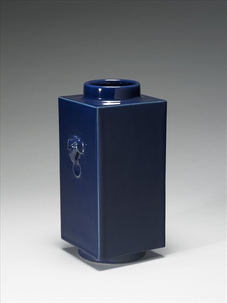 器仿禮器玉琮形,中圓外方,圓口微斂,平肩,方形器身,深直腹,圈足,帶銜環象首耳一對。通體施霽青釉,色靛藍光亮。圈足露白胎,底心青花書「大清乾隆年製」三行六字篆款。