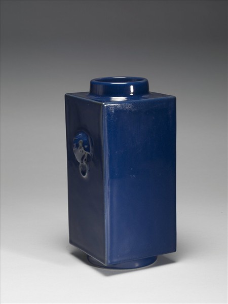 器仿禮器玉琮形,中圓外方,圓口微斂,平肩,方形器身,深直腹,圈足,帶銜環象首耳一對。通體施霽青釉,色靛藍光亮。圈足露白胎,底心青花書「大清乾隆年製」三行六字篆款。