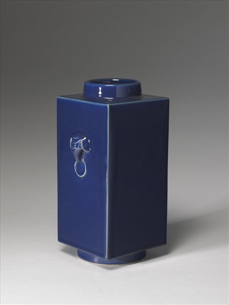 器仿禮器玉琮形,中圓外方,圓口微斂,平肩,方形器身,深直腹,圈足,帶銜環象首耳一對。通體施霽青釉,色靛藍光亮。圈足露白胎,底心青花書「大清乾隆年製」三行六字篆款。