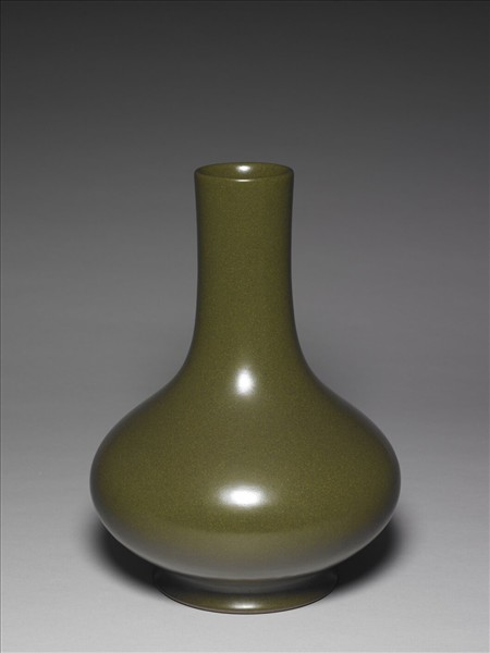 瓶,直口,長頸,斜肩,扁腹,圈足。全器施茶葉末釉,呈橄欖綠色,釉色均勻沉穩。圈足底緣露胎,塗淺褐色護胎汁,底心模印「大清乾隆年製」六字三行篆款。
