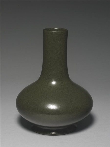 瓶,直口,長頸,斜肩,扁腹,圈足。全器施茶葉末釉,呈深綠色,釉色均勻沉穩。圈足底緣露胎,塗褐色護胎汁,底心模印「大清乾隆年製」六字三行篆款。
