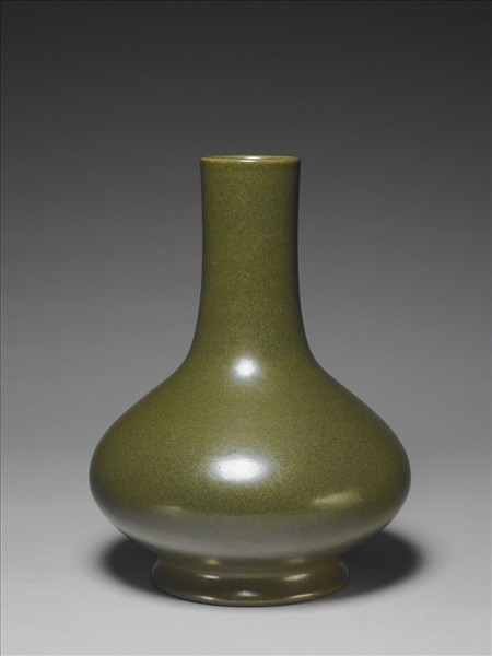 瓶,直口,長頸,斜肩,扁腹,圈足。全器施茶葉末釉,呈橄欖綠色,釉色均勻明亮。圈足底緣露胎,塗鐵黑色護胎汁,底心模印「大清乾隆年製」六字三行篆款。