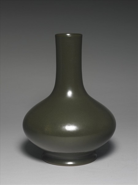 瓶,直口,長頸,斜肩,扁腹,圈足。全器施茶葉末釉,呈深綠色,釉色均勻沉穩。圈足底緣露胎,塗褐色護胎汁,底心模印「大清乾隆年製」六字三行篆款。