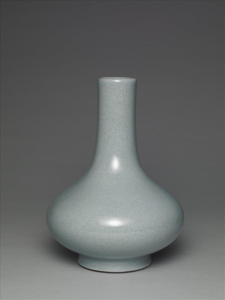 瓶,直口,長頸,斜肩,扁腹,圈足外撇。全器施青釉,呈粉青色,釉色溫潤,釉面佈滿細密開片紋。圈足底緣露胎,塗褐色護胎汁,底心以青花書「大清乾隆年製」六字三行篆款。