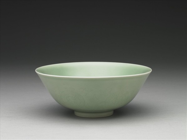 敞口,深弧壁,矮圈足。全器內外罩施冬青釉,外壁施釉至足際,口沿處呈一道白邊。外壁以暗花技法於口沿飾雙圈弦紋,腹壁飾幾何化之花葉紋。白地足內底書「大清嘉慶年製」青花篆款。