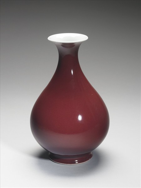 玉壺春瓶,撇口,束頸,溜肩,圓腹,外撇圈足。瓶身內壁施白釉,外壁施深紅色釉至足際,足露胎。器外白地底書「大清乾隆年製」青花篆款。