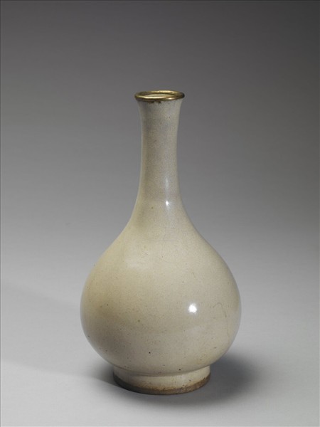 玉壺春瓶,直口圓唇,長直頸,斜肩,鼓腹,圈足。器外壁罩施米白色釉至圈足中段,修釉甚為齊整,足部餘地露出褐色胎。釉色濃重飽滿,釉面帶鐵灰色開片。口沿處鑲有金色金屬釦。