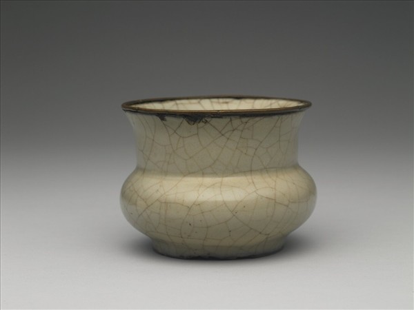 六瓣花口,口沿加嵌銅釦,寬頸,扁圓腹,矮圈足。內外施青釉,釉色米黃泛灰,內口沿及器表有灰棕色開片。內底可見六枚支燒痕,施釉至足際,足端無釉加塗鐵汁,局部露出灰土色胎。同類器見於英國V&A 博物館的收藏,器形相似的出土例則有四川省窖藏的龍泉窯青瓷,韓國新安海底沉船及浙江省老虎洞窯址所見形態不同的渣斗式器身。從中可一窺此一器式流通於宋元之際各大窯場的情形。 根據明人王宗沐《江西省大志》所記,嘉靖年間御器廠燒製的「桌器」中存在一式「渣斗」,暗示渣斗使用於餐飲之列。其器形對照乾隆朝《活計檔》記事,從乾隆八年(1743)御窯場燒造一類「洋彩玲瓏渣斗」正是傳世「清乾隆青花描金轉心渣斗」,而可回溯這類器形當時的確稱為渣斗。因此類推乾隆九年(1744)皇帝親自御筆畫樣送燒的哥窯渣斗,很可能臨仿自本件展品。由於乾隆皇帝要求「不要款式」,「仿得舊更好」,那件新造完成的仿宋青瓷究竟為何,目前已無法確認。