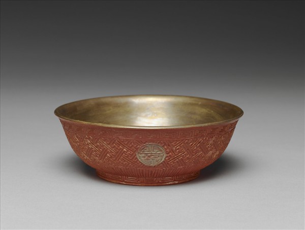 碗撇口,弧腹,璧足。仿雕漆作品,外壁於素胎時雕刻紋飾,於四面各刻一團壽紋,旁襯萬字不斷錦地,腹部下緣刻蓮瓣紋一周,口沿及圈足外雕回紋一周。全器罩施仿漆紅釉,在團壽紋處再填白彩,二次低溫燒成;碗內塗金漆。