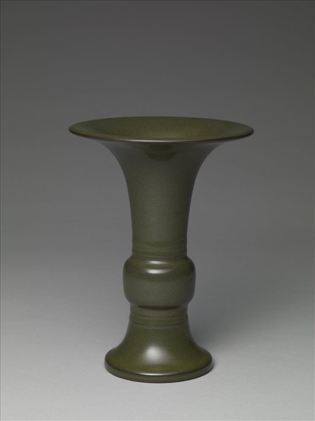 器仿青銅器觚形,喇叭口,長頸,鼓腹,長脛外撇,淺圈足。通體施茶葉末釉,色沈綠。外壁光素無紋,只在頸部近腹處與足牆近腹部處,各見凸弦紋兩圈。圈足露胎塗褐色汁,足內亦施茶葉末釉,正中央模印「大清乾隆年製」三行六字篆款。