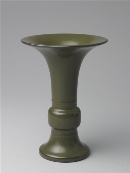 器仿青銅器觚形,喇叭口,長頸,鼓腹,長脛外撇。通體施茶葉末釉,色沈綠。外壁光素無紋,只在頸部近腹處與足牆近腹部處,各見凸弦紋兩圈。圈足露胎,足內亦施茶葉末釉,正中央模印「大清乾隆年製」三行六字篆款。