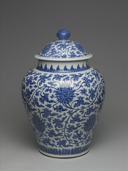 圓口,短直頸,豐肩外鼓,肩部以下漸斂,平底內凹。帶寶珠鈕蓋。器外壁白地青花繪飾圖樣,頸部變形波濤紋,腹外壁滿繪盛開的纏枝番蓮花葉,蓋外壁亦見相同的紋飾,青料色稍淡,讓整體繁麗的效果增添一些清雅之氣。底外露胎無款識。
