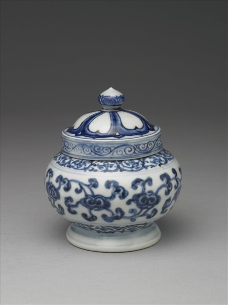 直口,圓腹,足外撇,圈足內雙階式底。圓腹主紋為轉枝靈芝紋,其上下則分別以雙青線區隔,裝飾卷草紋一周,口沿及足壁以青線三道為飾。釉色青濃,多帶褐黃結晶疵斑。胎骨厚重,罐身接痕一道,圈足露胎,質堅細膩。底書「大明宣德年製」二行六字楷款款,外加雙圈。