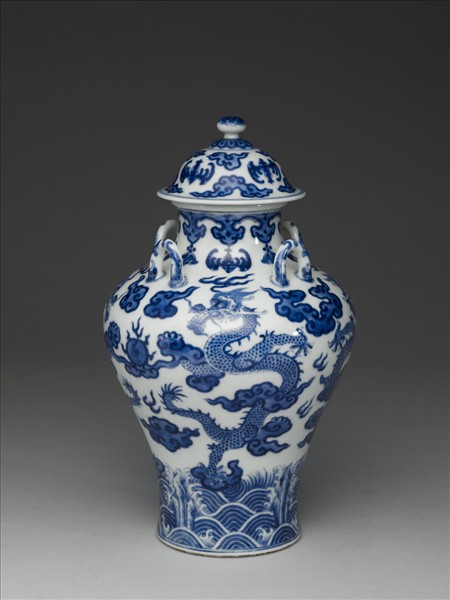 四繫蓋罐,直口微撇,圓唇,短頸,豐肩驟收,長腹下斂,凹足;帶蕈狀鈕笠形子口蓋,肩部分列四立環耳。外壁以青花為飾,蓋壁飾蓮瓣紋、四蝠紋及朵雲紋。器口飾一圈如意雲紋,頸部有蝠及磬,腹部主紋繪兩組雙龍搶珠紋,隙地填繪朵雲紋,脛部飾壽山福海,耳繪對螭紋。足底緣露白色胎,底心以青花書「大清乾隆年製」六字三行篆款。