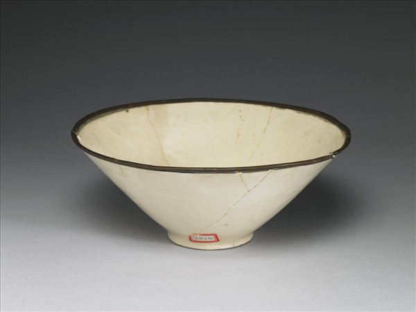 敞口,弧壁,圈足,口緣鑲銅釦一周。通體施白釉,釉面滿佈細碎開片。全器光素無紋,足露胎。