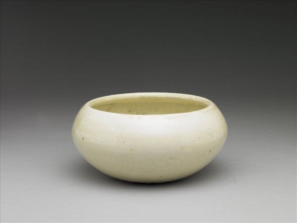 斂圓口,斜肩,碩腹下斂,凹足。通體白釉,釉色泛黃,有細碎開片。底足露胎。