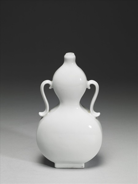全器作扁葫蘆形,小圓口,簡單型雲紋式耳,方足。全器罩透明釉,釉色瑩潤潔白。全器光素無紋,底足露胎,足內亦滿施透明釉。