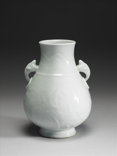 器仿銅壺形,頸兩側飾獸首銜環,頸肩相接處凸起一道弦紋,頸部雕飾的環帶雲,排列若山形,上下並間飾如意雲紋。腹部則雕飾螭紋與環帶雲紋。圈足外撇,面飾波浪狀線紋,通體施淺粉青色釉,釉色瑩潤,底落青花篆書「大清雍正年製」三行六字款。