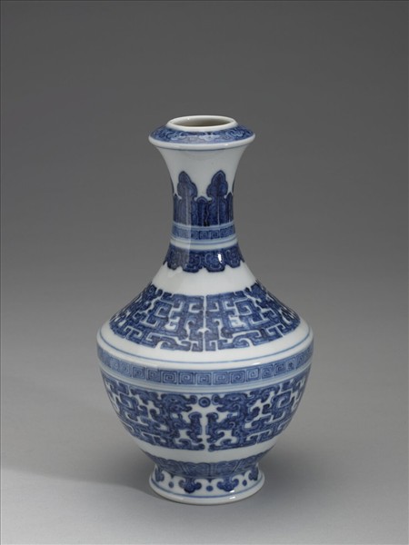 青花瓶,盤口、短頸、折肩、碩腹下斂、撇足。器身白地,繪青花紋樣。口緣繪如意雲頭紋一周,頸部繪蕉葉紋、回紋與變形蓮瓣紋。肩部繪二龍紋,兩兩相視,二口中間有一圓珠,下緣飾一弦紋;腹部亦繪二龍紋,兩兩相視,二口中間有一圓珠,腹部上緣飾回文一周,底邊繪蓮瓣紋;足部繪如意雲頭紋一周,並飾弦紋一道。如意雲頭紋、蓮瓣紋和龍紋均採勾邊留白技法描繪而成。器底圈足露胎,圈足內施白釉,有青花書「大清乾隆年製」三行六字篆款。