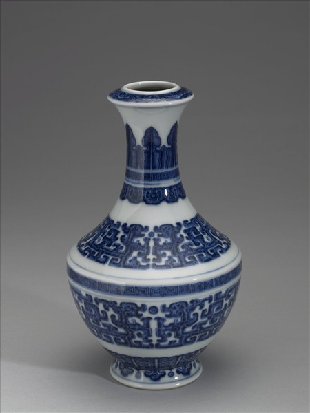 青花瓶,盤口、短頸、折肩、碩腹下斂、撇足。器身白地,繪青花紋樣。口緣繪如意雲頭紋一周,頸部繪蕉葉紋、回紋與變形蓮瓣紋。肩部繪二龍紋,兩兩相視,二口中間有一圓珠,下緣飾一弦紋;腹部亦繪二龍紋,兩兩相視,二口中間有一圓珠,腹部上緣飾回紋一周,底邊繪蓮瓣紋;足部繪如意雲頭紋一周,並飾弦紋一道。如意雲頭紋、蓮瓣紋和龍紋均採勾邊留白技法描繪而成。器底圈足露胎,圈足內施白釉,有青花書「大清乾隆年製」三行六字篆款。