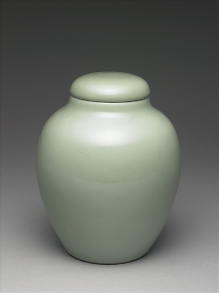 罐直口、短頸圓肩、斂腹,凹足,帶一圓頂子母口蓋。全器施青釉,呈冬青色,釉色均勻。足端露胎,呈白色。底有青花書「大清乾隆年製」六字三行篆書款。