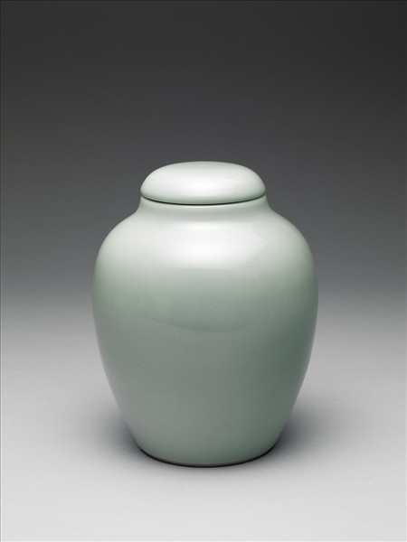 罐直口、短頸圓肩、斂腹,凹足,帶一圓頂子母口蓋。全器施青釉,呈冬青色,釉色均勻。足端露胎,呈白色。底有青花書「大清乾隆年製」六字三行篆書款。
