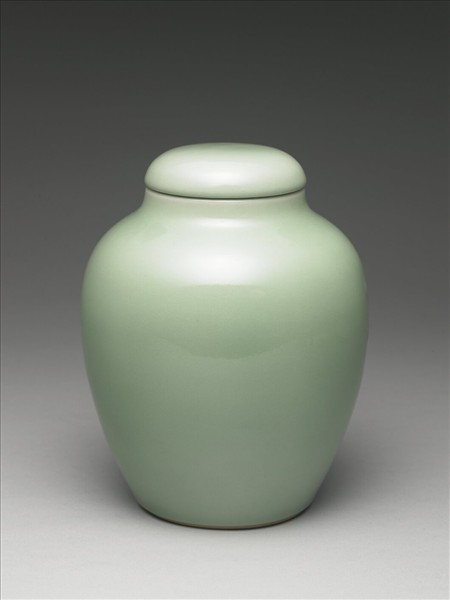 罐直口、短頸圓肩、斂腹,凹足,帶一圓頂子母口蓋。全器施青釉,呈冬青色,釉色均勻。足端露胎,呈白色。底有青花書「大清乾隆年製」六字三行篆書款。