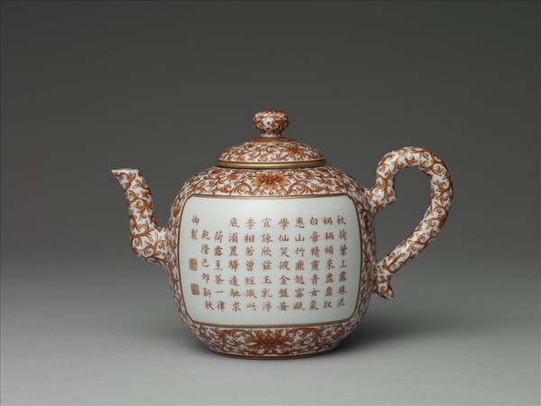 斂圓口,弓形把,曲流,圓頂蓋,蓋側一通氣孔。通體以礬紅描繪纏枝番蓮紋,腹部兩面開光,一面繪荷塘蓮花,一面書乾隆題詩:「秋荷葉上露珠流,柄柄傾來盎盎收。白帝精靈青女氣,惠山竹鼎越窯甌。學仙笑彼金盤妄,宜詠欣茲玉乳浮。李相若曾經識此,底須置驛遠馳求。」「荷露烹茶一律,乾隆己卯新秋御製」,並有硃紅「比德」「朗潤」二印。器蓋畫轉枝番蓮紋,紐則畫盛開蓮花一朵,紐側並飾有花朵一周。口沿及蓋沿塗金,壺里及器蓋內面全施綠彩。器底以礬紅書「大清乾隆年製」六字三行篆款。 壺上詩文為乾隆二十四年(1759)秋天所作,詩題為〈荷露烹茶〉。同時燒製的還有與壺成套的描紅荷花茶碗,碗上亦題有相同詩文。