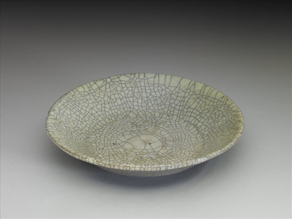 六瓣葵花式口盤,口外撇,平底,圈足,足挖過肩,足緣窄細一圈無釉,顯露黑色胎土。施灰青色釉,釉厚處色稍綠,釉質微乳濁不透,釉面滿佈開片,深者成黑色,淺者微帶褐色,是所謂「金絲鐵線」,內外底心及外壁有縮釉痕。