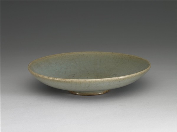 圓洗,敞口,弧壁,弧底,圈足。施灰青色釉,釉面佈滿細密淺褐色開片,口沿釉薄處呈灰色。足緣無釉露灰色胎。