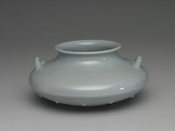 微侈口,短頸,折肩,雙立耳,斂腹,三乳足。全器施青釉,釉色晶潤,釉面有淺褐色細密開片紋,腹部裝飾一圈乳丁紋。足底塗護胎汁,呈褐色,底心以青花書「大清乾隆年製」六字三行篆款。