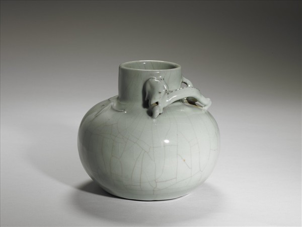 直口圓腹瓶,凝厚的粉青釉滿佈細密淺淡的褐色開片,底部無釉塗為黑色且磨壟光亮,原亦似在模仿南宋官窯類的釉色,但其口緣蟠繞一長尾異獸,獸形如虎,應是取材於龍泉窯龍虎罐的裝飾元素。