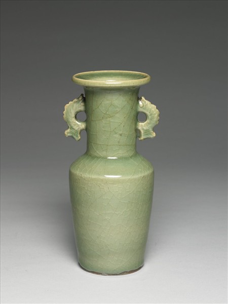紙槌瓶器身,盤口、長頸、折肩、筒形長腹、底淺挖為圈足。頸兩側各貼飾魚形半環耳。全器施豆綠色青釉。釉面玻狀透亮,表面有開片,釉薄處現淺胎色;足內沾沙,足緣無釉,露灰色胎及火石紅。長頸盤口瓶是宋代常見的造形,龍泉青瓷更常在長頸兩側常加飾反身鳳耳或魚形耳,此種造型在海外的貿易瓷遺址也經常見及,新安海底沉船的考古遺物便有此二種耳型的器形。黃綠調的豆青色是元代龍泉窯系的主色調,由於產量豐富,像本件魚耳瓶的玻釉開片或色偏褐黃、灰綠等不穩定現象皆有之。