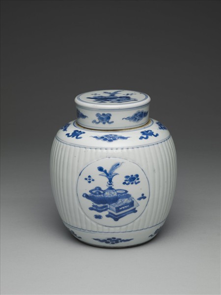 斂口,短頸,燈籠式器身,上下斂而中腹圓鼓,平底,淺凹足,帶平頂圓蓋。以青花為飾,罐肩與底邊各有朵雲紋及雜寶紋飾一周,腹有三圓形開光,分別繪製博古圖、梅樹及喜鵲花卉,筆繪清麗。蓋頂繪博古圖,蓋邊則飾朵雲紋及雜寶紋飾一周。口頸露胎,腹部開光之外為素色胚體,並刻劃出直棱柳條狀紋。蓋底緣、內壁及足部皆露胎。