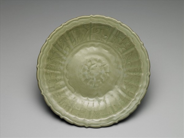 花口折沿盤,敞口、弧形壁、圈足。口沿平出,作十二瓣蓮花式口,沿邊起細唇棱高起;沿面再劃刻雙線紋隨形勾邊。內外器壁作凹凸直條摺棱,內壁刻劃纏枝花卉,線條熟練快速。內底寬平,中央印花一枝,模糊難辨,圍以雙線勾勒之四瓣菱花邊。裹足滿釉,底部有環形無釉墊燒區,環緣斑駁不整。類似的造型、裝飾,與元代類型如新安沈船者相似。