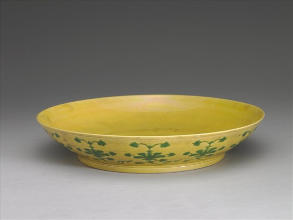 敞口盤,弧壁下斂,圈足。器內外滿施黃釉,外壁黃地飾等距排列的綠色折枝番蓮花葉,由於枝梗弧曲,整體亦呈現如連續卷枝花葉的裝飾效果。圈足內白地青花書「大清乾隆年製」三行六字篆款。此外,外壁所裝飾的卷枝花葉,都是預先在胎體上剔刻後,才於黃釉地上覆加低溫綠釉,有些綠釉未及的部份,還可見到黃釉地色。這一類先剔刻花紋黃地綠釉施作,是遠承於明代,珠山遺址就曾出明代永樂時期的黃釉綠彩器,傳世的黃釉綠彩器則可上溯至明弘治朝。而如本器的作品,嘉慶朝亦見燒造,可見這一類黃釉綠彩器,是燒造傳統延續甚長的品類。