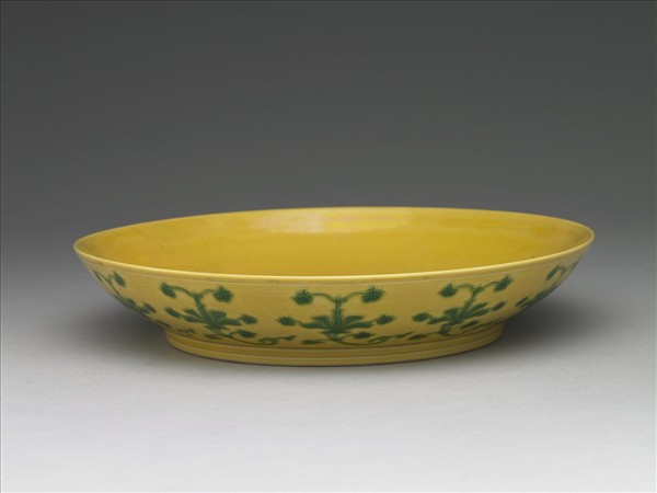 敞口盤,弧壁下斂,圈足。器內外滿施黃釉,外壁黃地飾等距排列的綠色折枝番蓮花葉,由於枝梗弧曲,整體亦呈現如連續卷枝花葉的裝飾效果。圈足內白地青花書「大清乾隆年製」三行六字篆款。此外,外壁所裝飾的卷枝花葉,都是預先在胎體上剔刻後,才於黃釉地上覆加低溫綠釉,有些綠釉未及的部份,還可見到黃釉地色。這一類先剔刻花紋黃地綠釉施作,是遠承於明代,珠山遺址就曾出明代永樂時期的黃釉綠彩器,傳世的黃釉綠彩器則可上溯至明弘治朝。而如本器的作品,嘉慶朝亦見燒造,可見這一類黃釉綠彩器,是燒造傳統延續甚長的品類。