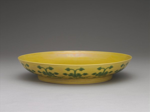 敞口盤,弧壁下斂,圈足。器內外滿施黃釉,外壁黃地飾等距排列的綠色折枝番蓮花葉,由於枝梗弧曲,整體亦呈現如連續卷枝花葉的裝飾效果。圈足內白地青花書「大清乾隆年製」三行六字篆款。此外,外壁所裝飾的卷枝花葉,都是預先在胎體上剔刻後,才於黃釉地上覆加低溫綠釉,有些綠釉未及的部份,還可見到黃釉地色。這一類先剔刻花紋黃地綠釉施作,是遠承於明代,珠山遺址就曾出明代永樂時期的黃釉綠彩器,傳世的黃釉綠彩器則可上溯至明弘治朝。而如本器的作品,嘉慶朝亦見燒造,可見這一類黃釉綠彩器,是燒造傳統延續甚長的品類。