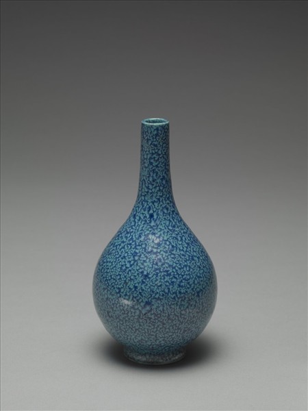 口微斂,細長頸,腹部下垂如膽,矮圈足。通體施罩藍釉,因釉彩本身乳濁黏稠、流動緩慢,故鈞釉成為較易燒造上下交疊、色澤不同之釉彩。清雍正時,為配合皇帝嗜古的品味,督陶官唐英派遣吳堯圃前往鈞州考察窯址。從唐英《暮春送吳堯圃之鈞州》的詩中對於仿燒的企盼,可以了解清代對於鈞瓷的延燒情形與熱愛。乾隆朝雖因襲雍正以來仿鈞釉的作品,但因皇帝品味不同,以至於傳世鈞瓷的器形、釉色有所差異。