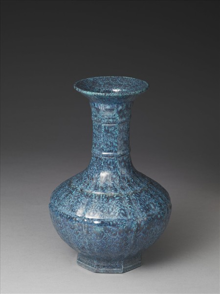 八棱形琢器,侈口,長頸,削肩,碩腹,圈足外撇。自頸至腹,器身凸飾六道弦紋,通體內外及足底均施爐鈞釉,藍釉自然垂流,其間密佈天青斑點,釉面凝厚。足底「大清乾隆年製」六字篆印。爐鈞釉於雍正年間開始燒製,盛行於雍正、乾隆兩朝。