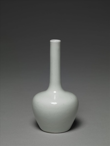直口,細長頸,豐肩,碩腹下斂。通體施罩白釉,色澤泛青,外壁釉下暗花龍紋,足底書青花「大清雍正年製」六字雙行雙圈楷書款。