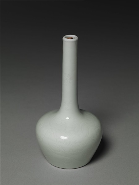 直口,細長頸,豐肩,碩腹下斂。通體施罩白釉,色澤泛青,外壁釉下暗花龍紋,足底書青花「大清雍正年製」六字雙行雙圈楷書款。